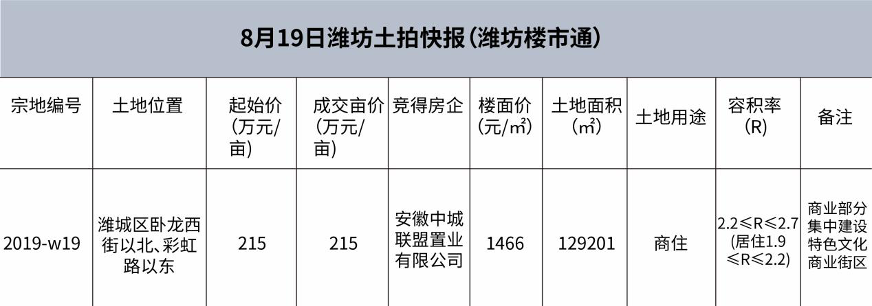 8月19日,在竞争激烈的潍坊土拍中,我司传来捷报,成功竞得潍城区2019-W19优质地块,至此,集团已在潍坊斩获5块宝地,深耕潍坊的战略布局再获升级!