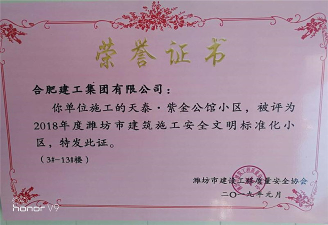 2018年底,寿光紫金府项目通过潍坊市建设工程质量安全协会验收,获得“2018年度潍坊市建筑施工安全文明标准化工地”荣誉。