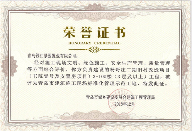 近日,从青岛城乡建设委员会传来喜讯,书院壹号项目经施工现场文明、绿色施工安全生产管理、质量管理等各方面综合评价,荣获青岛市建筑施工现场标准化管理示范工地称号。