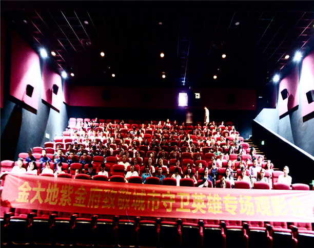 临近放映时间,入场大厅人头攒动。主持人进行了一场气氛热烈的推介会,向到场的英雄们致意,表达了金大地作为城市责任房企,对建筑城市的坚守,对家人的守护。也让前来观影的家人们感受到金大地·紫金府的热情服务与关怀。