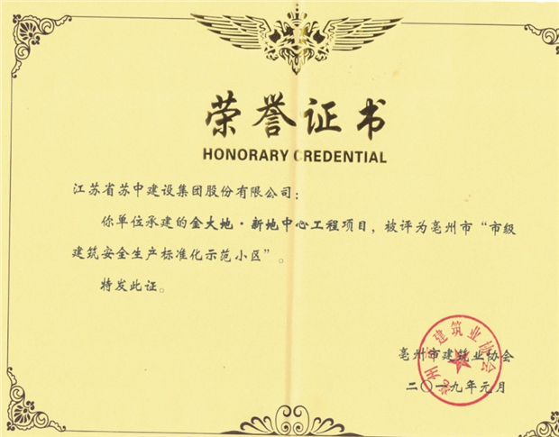 金大地涡阳新地中心荣获“建筑安全生产标准化示范小区”称号