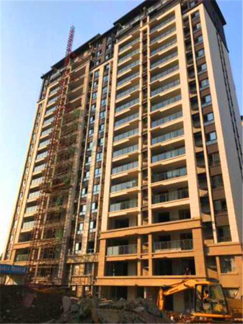 4#楼:外墙涂料完成6吊篮,公区施工中,阳台护栏玻璃安装基本完成。