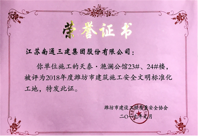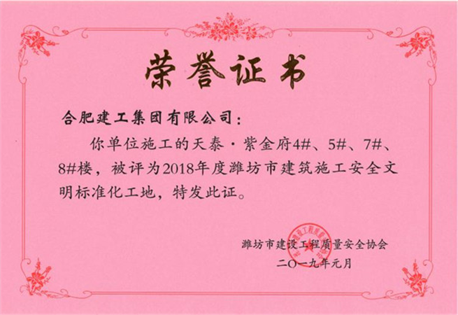 2018年底,寿光紫金府项目通过潍坊市建设工程质量安全协会验收,获得“2018年度潍坊市建筑施工安全文明标准化工地”荣誉。
